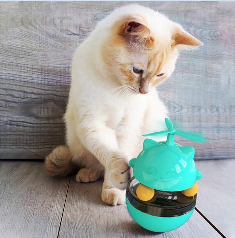 • The attractive distribution ball has two brightly colored balls on the rotating track in the middle waist, and a windmill fan on top to attract your cat's attention by releasing Food from the lower hole when your cat plays with the ball.